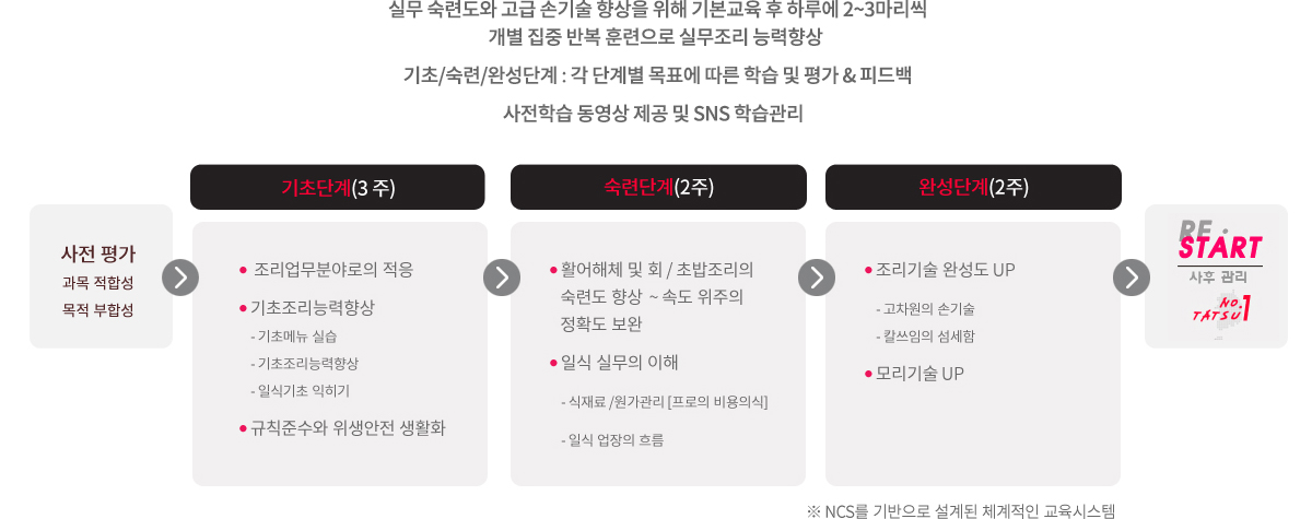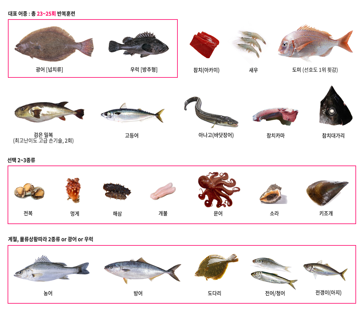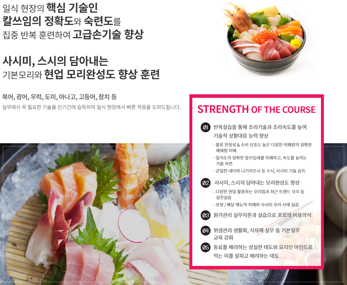 활어 해체와 회조리(사시미), 초밥조리(스시)를 주요 메뉴로 하는 소규모 업장에서 꼭 필요한 인재를 양성하기 위한 집중 훈련과정으로