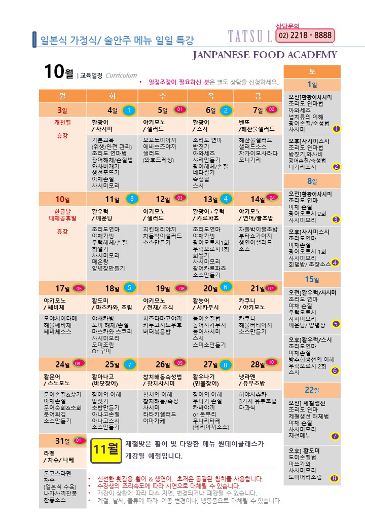 오전/저녁] 10월 일일특강(일본 가정식/이자카야 술안주 메뉴)