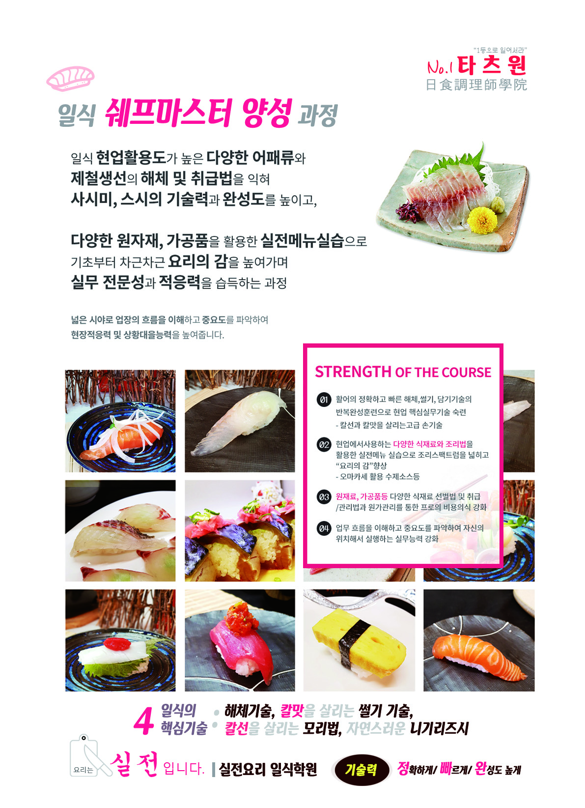 26가지 해체과제의 반복 숙련과 58가지 일식메뉴의 실전실습