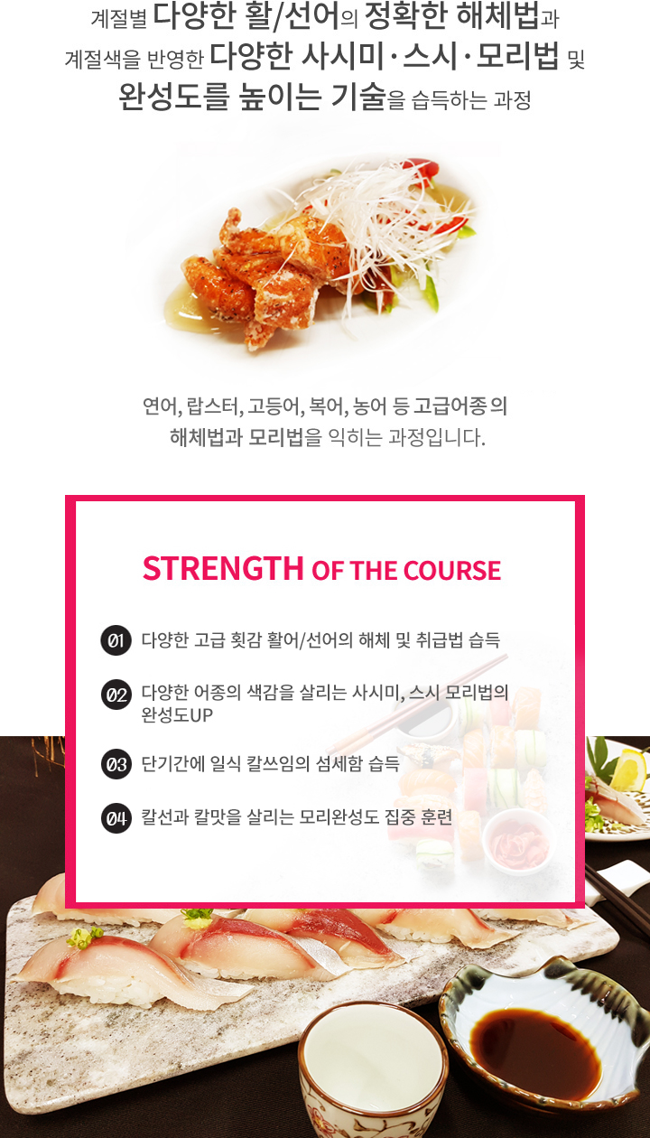 26가지 해체과제의 반복 숙련과 58가지 일식메뉴의 실전실습