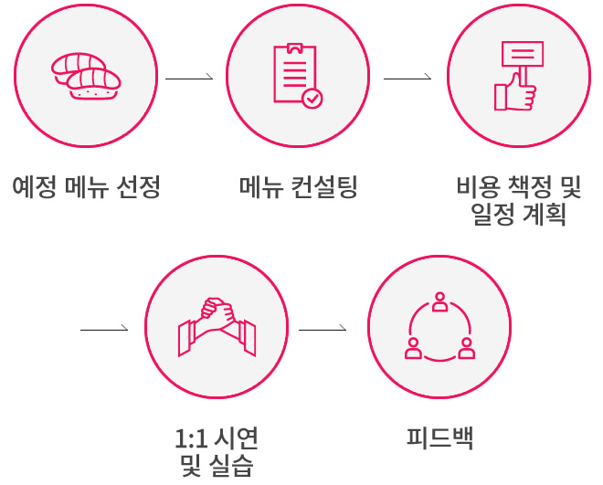 대중성을 이미 갖춘 메뉴를 선정, 조리핵심기술을 전수하여 전문성을 높임으로써 위험요소에도 흔들림 없이 중심을 잡을 수 있도록 하여 드립니다.