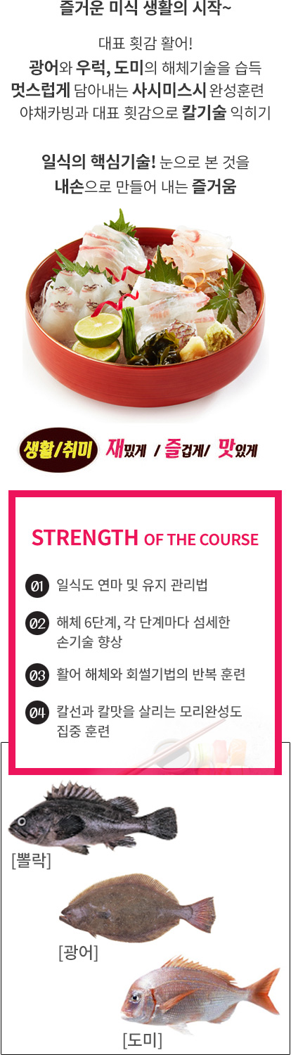 - 15~25년 이상의 실무와 훈련 경력을 고루 갖춘 일식 전문쉐프가 전하는 실전 노하우
